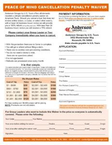 Peace of Mind Waiver is not effective until both the completed Application and Premium are received in house by Go Anderson Groups by U.S. Tours. Trip Assure must be purchased on line; click here for our secure website. Click on form to enlarge and print copies for your travelers.