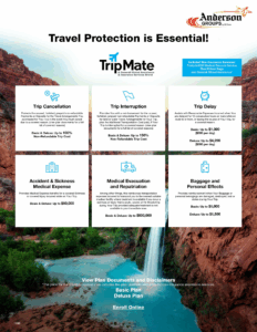 - Trip Assure: GoAndersonGroups by U S Tours has partnered with Trip Mate to offer a more robust travel protection plan. Trip Assure by Trip Mate offers coverage for trip cancellation, trip interruption, trip delay, medical coverage, and more. We believe their products provide you with the best coverage, price and service. This product is ideal for trips that involve airline tickets, cruises, and other select events. Your travelers must purchase directly online at our custom page.